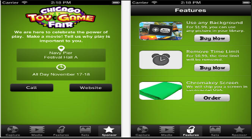 “The app gives you the ability to use an special effect known as Chroma Key or Green Screen in a simple, fun and quick way. Simply select multiple colors in the viewfinder by tapping the screen and instantly replace it with a video or picture of your choice. Imagine replacing the sky with a scene from space showing a planet spinning or changing the view out of your window into Niagara Falls. Green Screen lets you create special movie effects and instantly share and show off your video creations on Facebook, Dropbox, Twitter, email and others.”